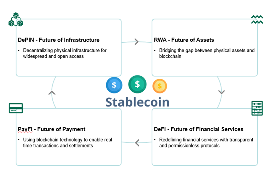 This evolution of stablecoins positions them as the cornerstone of a truly digital economy. There will be four interconnected domains where stablecoins are set to drive transformation: DePIN, RWA, PayFi, and DeFi. These pillars collectively illustrate the breadth of stablecoin applications, from decentralizing infrastructure to reshaping financial services. By anchoring stability and fostering trust within these sectors, stablecoins will enable seamless interaction across decentralized networks, real-world assets, payments, and innovative financial systems, forming the foundation for a cohesive and inclusive global economy.
